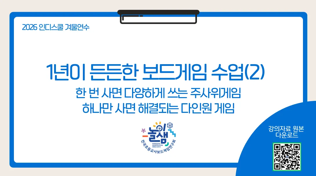 부족한 학교 예산 상황을 고려하여, 한 번 구매하면 다양한 교과와 활동에 활용할 수 있는 주사위 게임과, 하나만 구비해도 다인원 수업을 효율적으로 운영할 수 있는 보드게임을 소개합니다. 예산 대비 활용도를 높이고, 수업·놀이상황까지 폭넓게 적용할 수 있는 실전 중심의 게임 수업 방안을 공유하여 선생님들의 교실을 1년 내내 든든하게 채울 수 있는 아이디어를 나누고자 합니다.