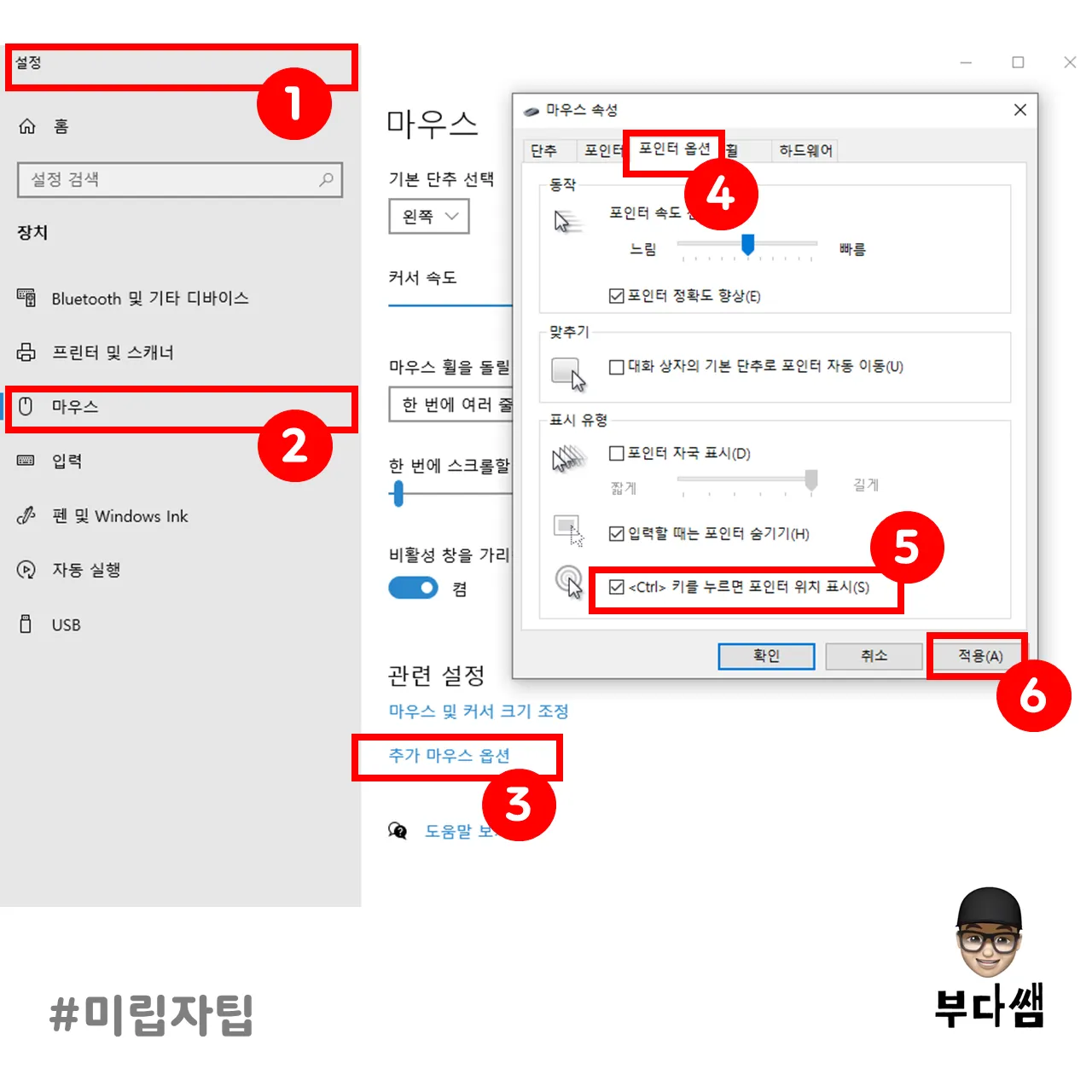 2. <Ctrl> 키를 누르면 포인터 위치 표시 [체크] - [적용]